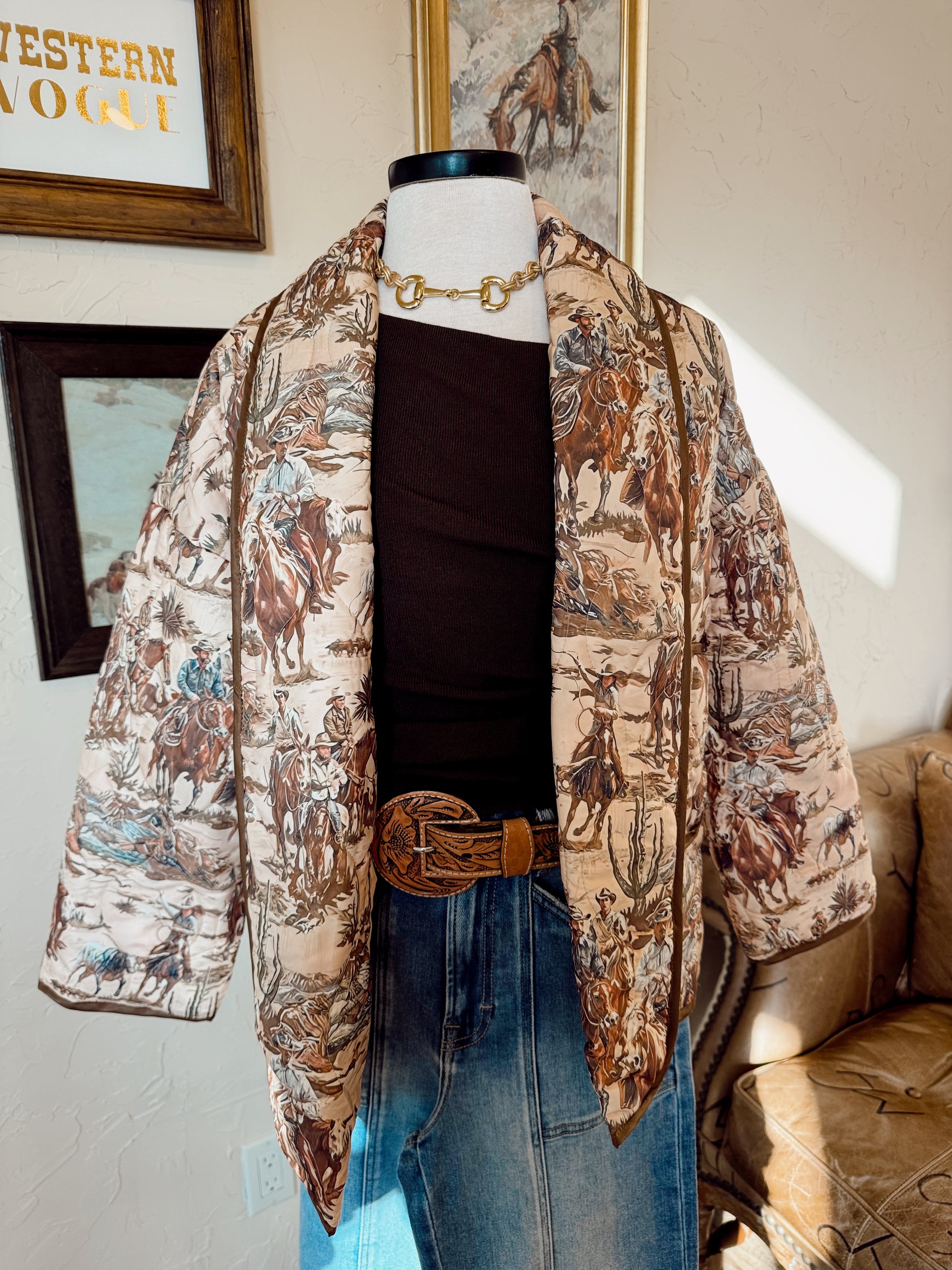 This cute quilted jacket is seriously the comfiest & coziest of all time! We can't get enough of the vintage cowboy print either! Features pockets & an open front.