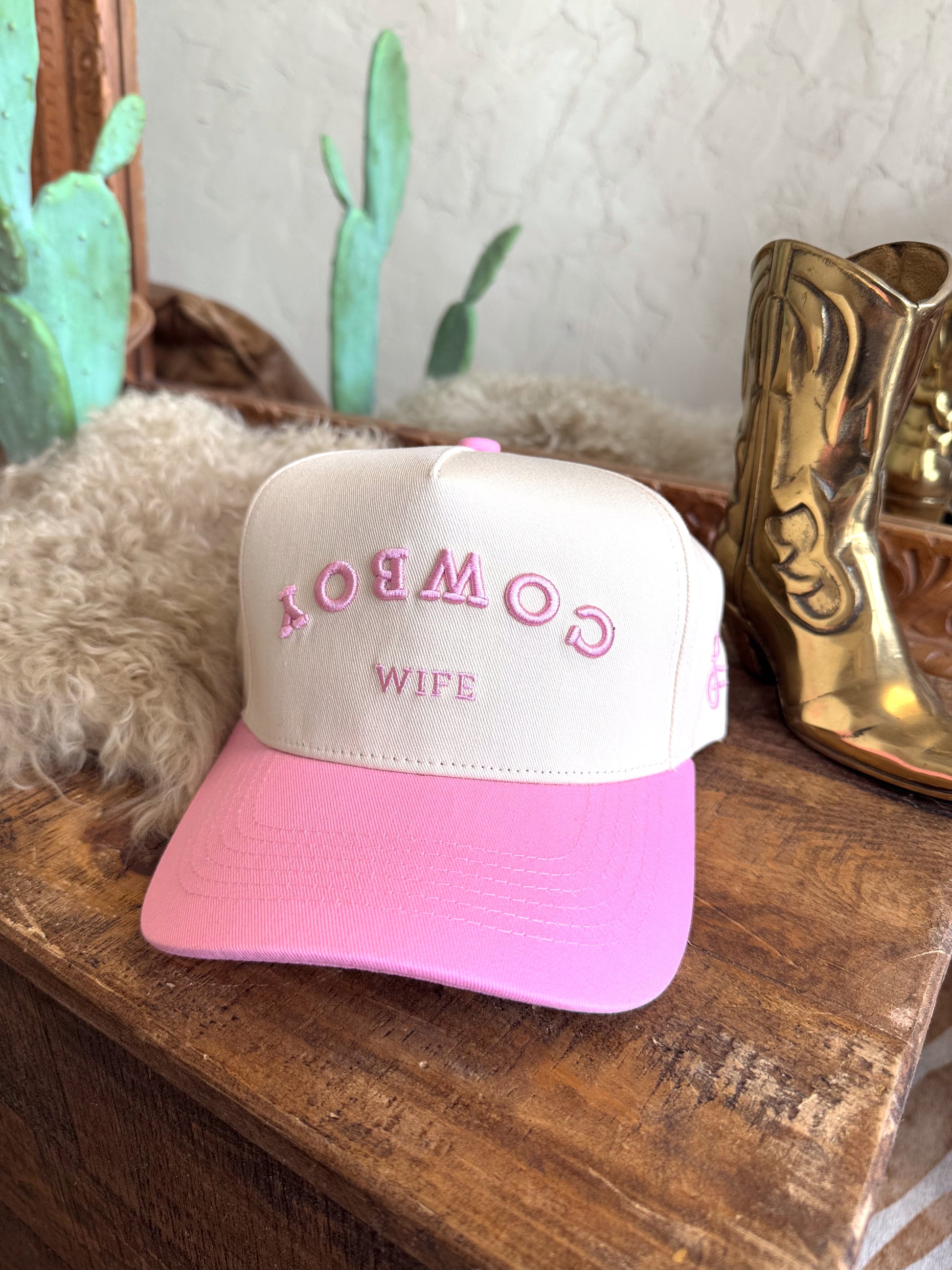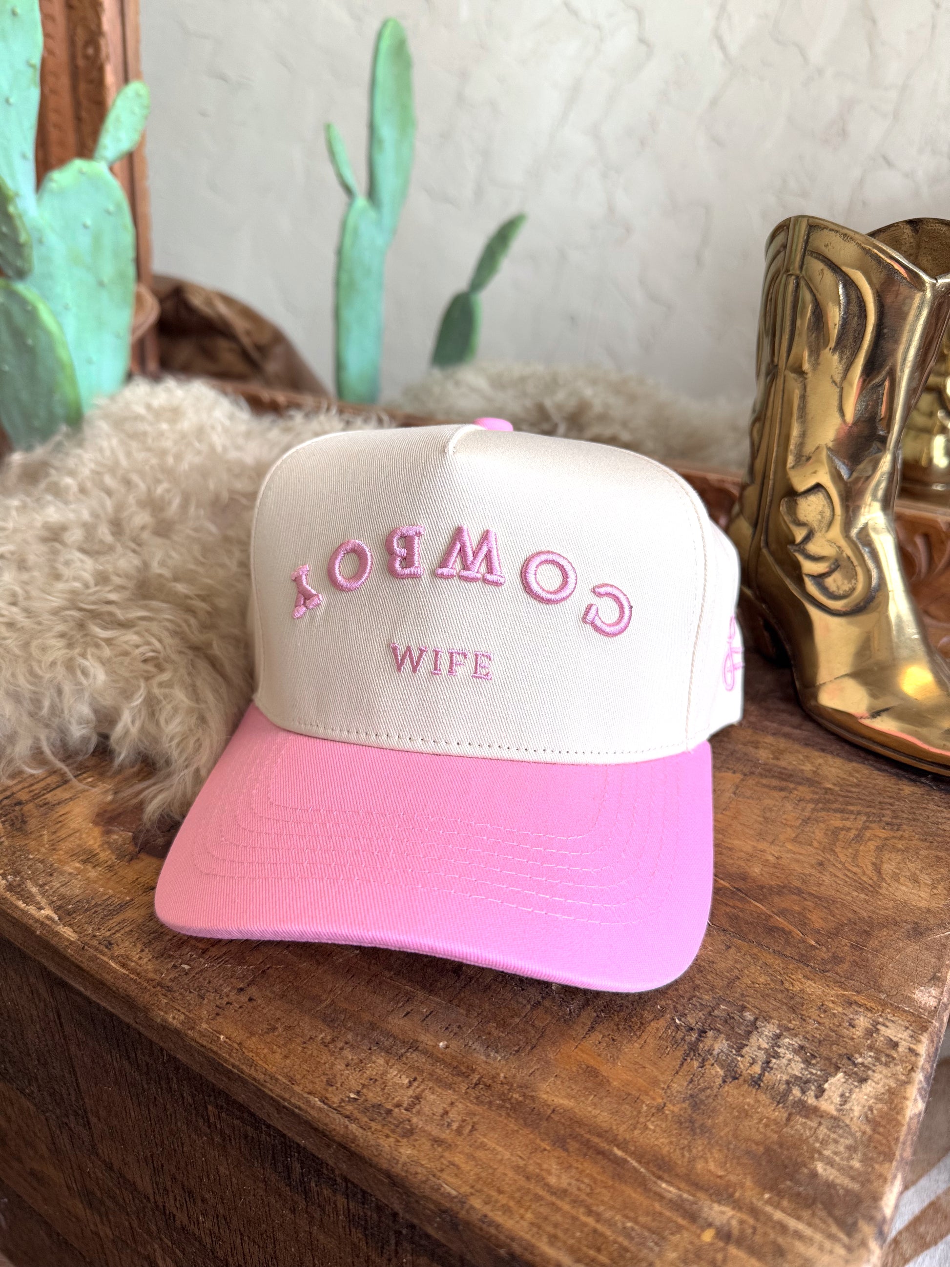 These new caps are so cute & perfect for those bad hair days too!! We are lovin' all caps right now!! Natural & pink mid profile baseball cap with pink embroidered “Cowboy Wife”.