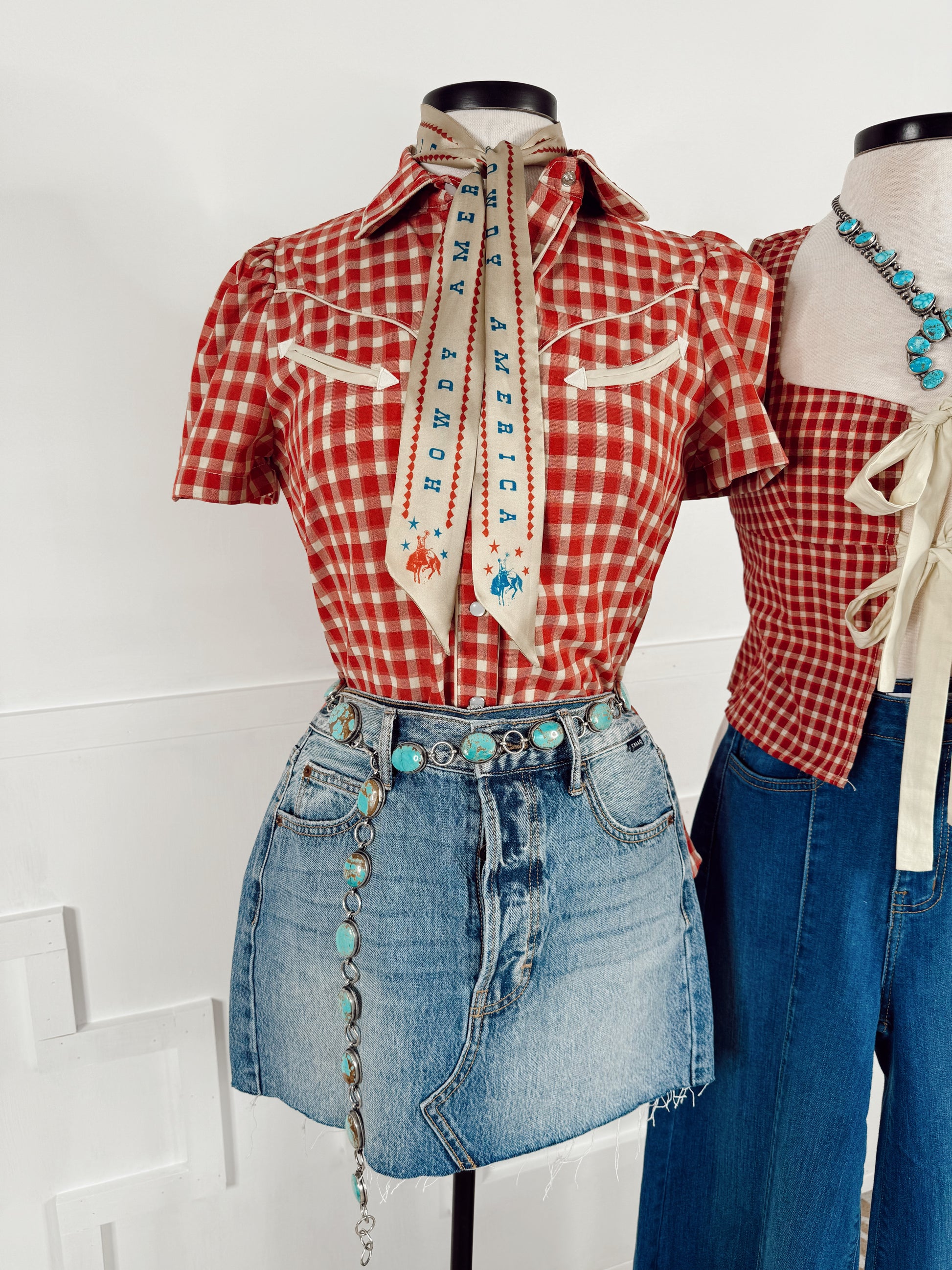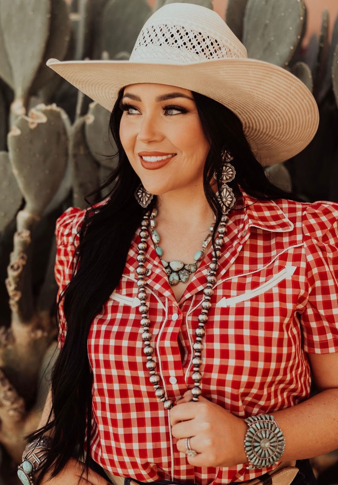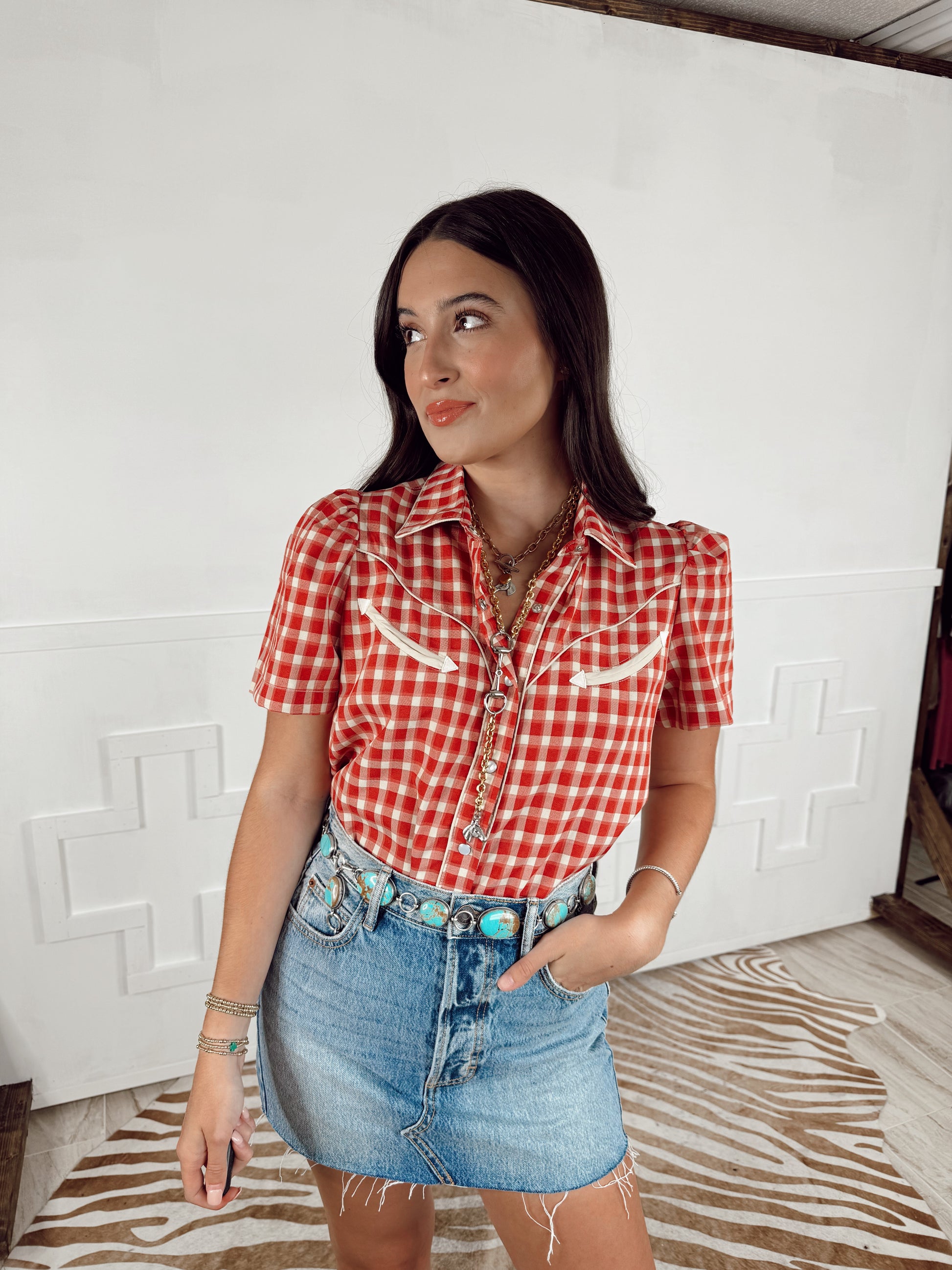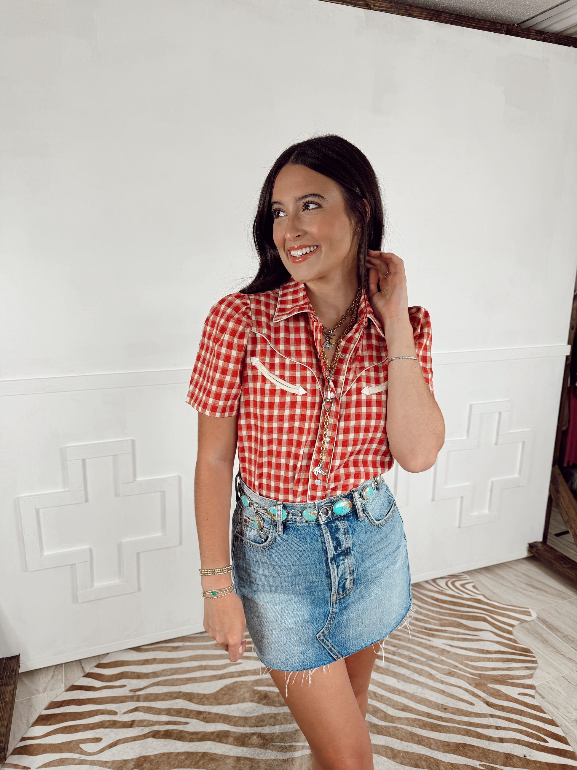 We are currently obsessing over this new gingham top. It’s such a great piece for your closet & perfect for the warmer weather. Features a puff sleeve, arrow details & pearl snap closure.
