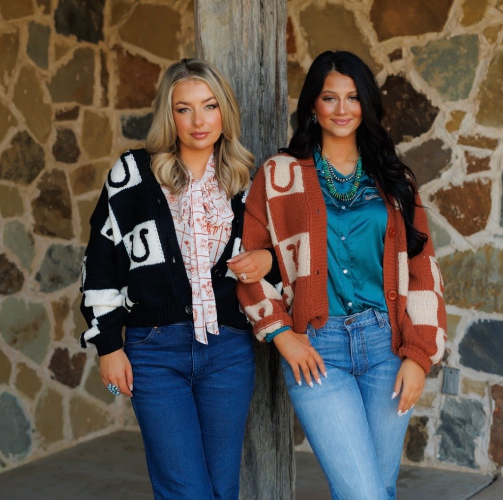 This checkered horseshoe cardigan is amazing, the quality is bar none & the detail is exceptional too! This timeless beauty will never go out of style. Features a button down front.