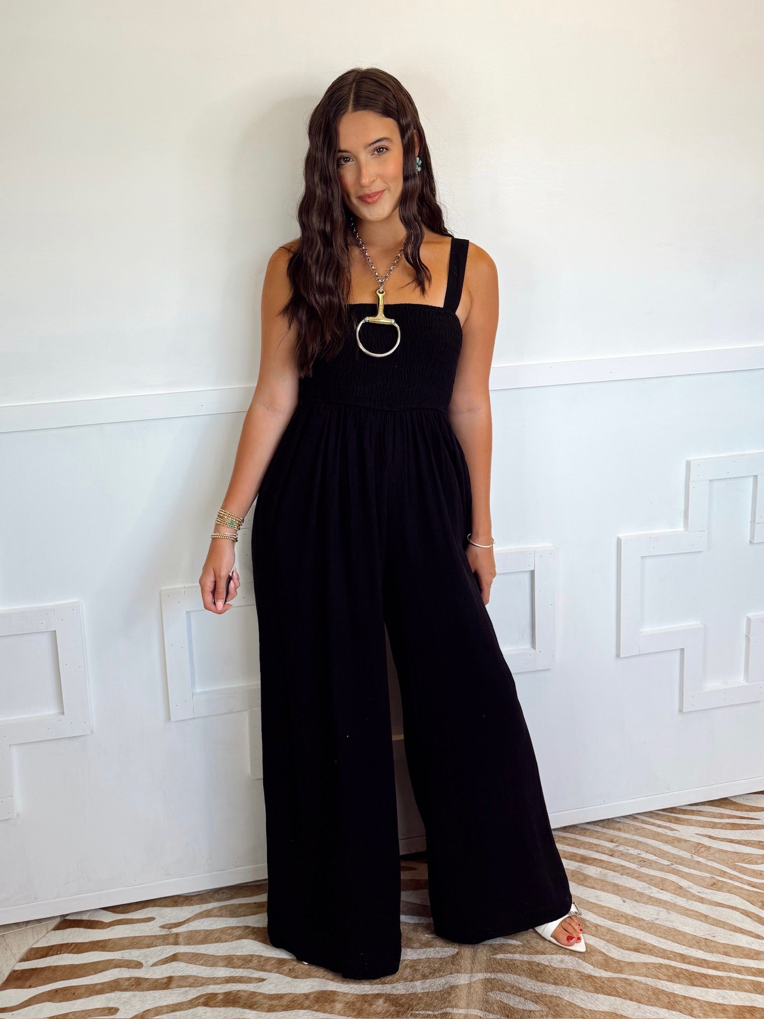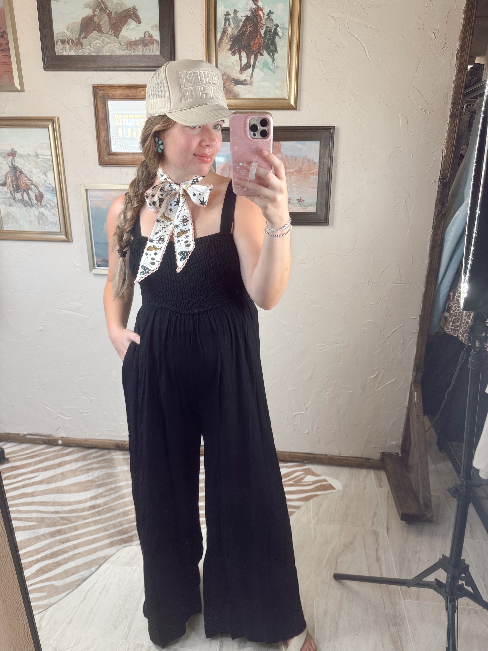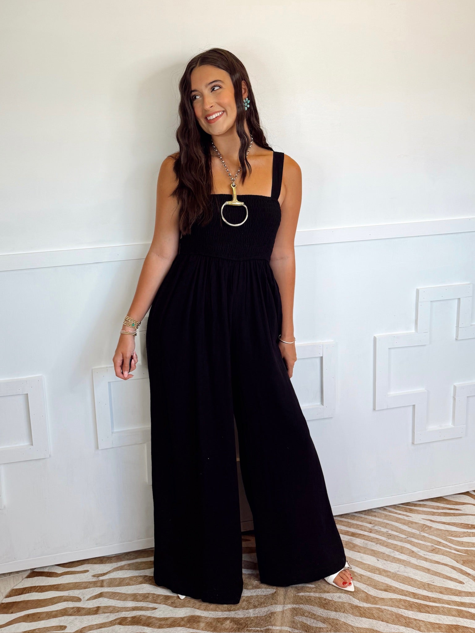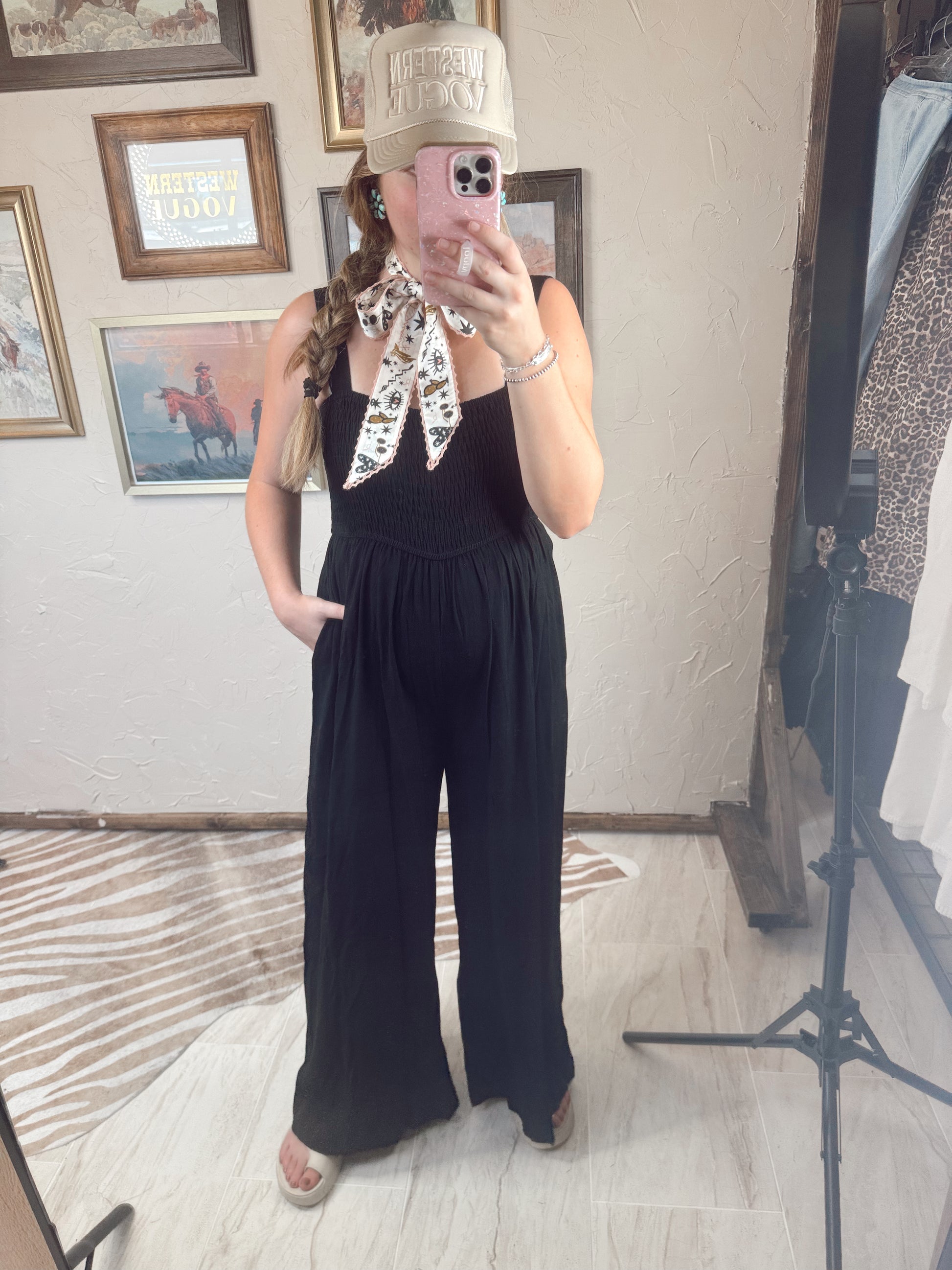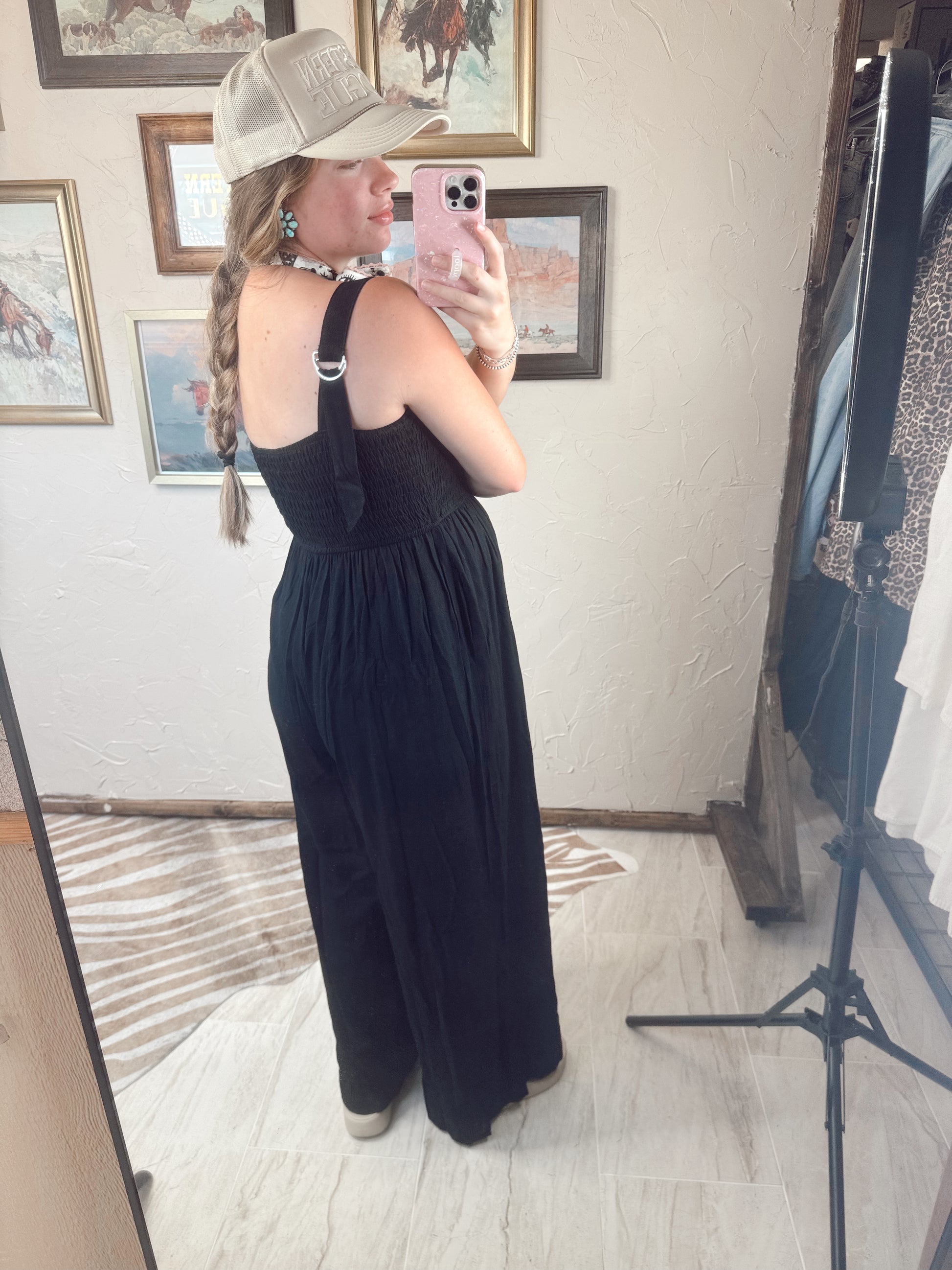 The perfect jumpsuit for any occasion! It's such a great piece for your wardrobe & so versatile. Features adjustable straps, smocked top & pockets.