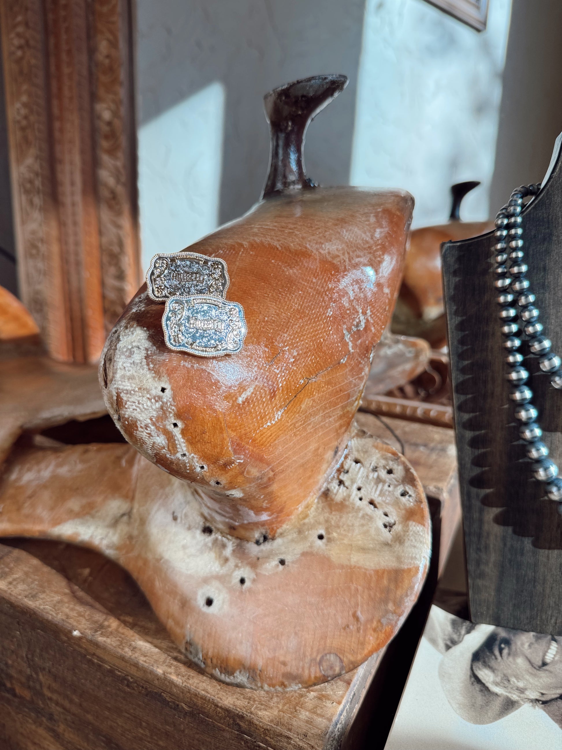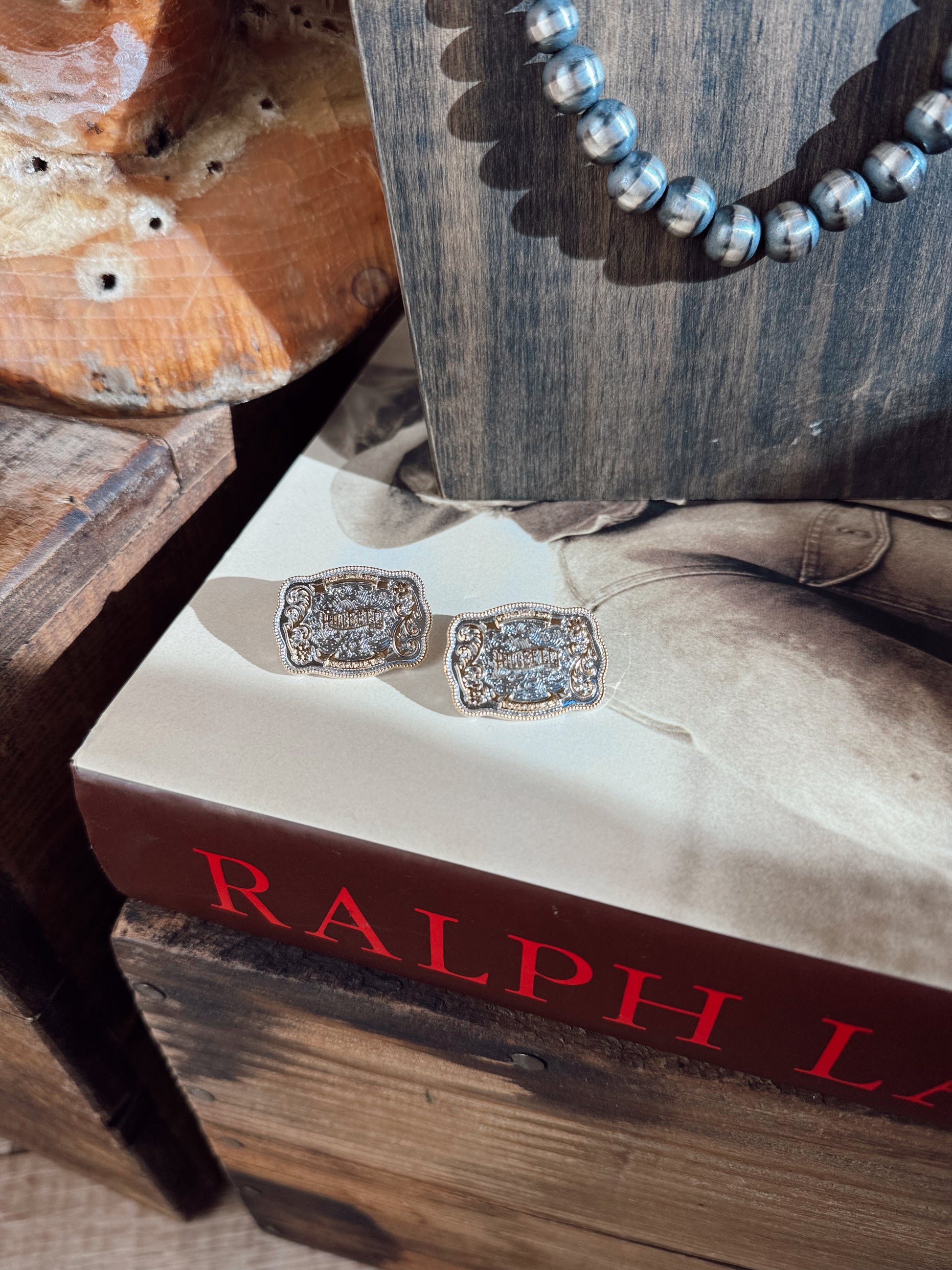 Bring the spirit of the arena straight to your jewelry game with the Rodeo Betty Earrings - a bold, buckle-inspired statement piece that blends western grit with Hillbetty glam. Available in mini size, each pair features a detailed, mixed silver-and-gold design that mirrors the look of a classic rodeo belt buckle. Lightweight enough for everyday wear but flashy enough for a night under the neon lights, these earrings are perfect for rodeos, concerts, honky-tonks, bachelorette trips, or any moment you want to turn heads—because Rodeo Betty doesn’t just show up… she shows out.