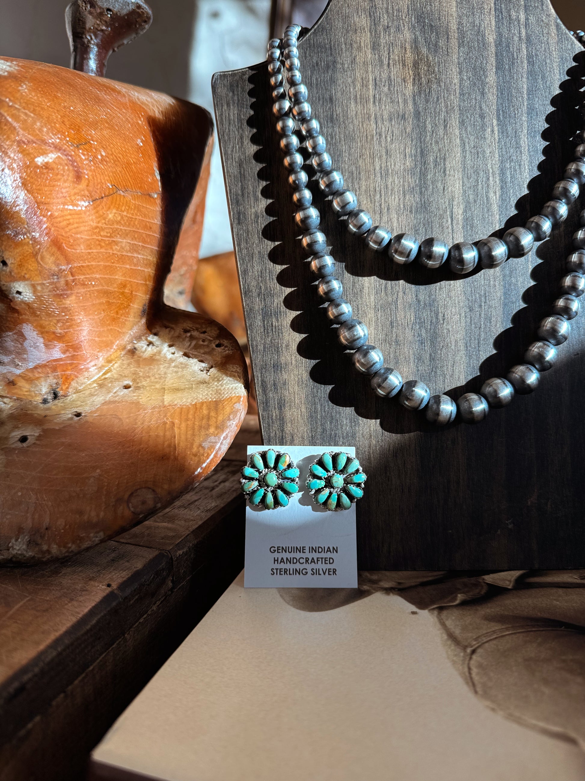 These are the cutest turquoise & sterling silver stud earrings! We are obsessed! Perfect for everyday wear & so light weight. .5”X .5” Stamped by Artist