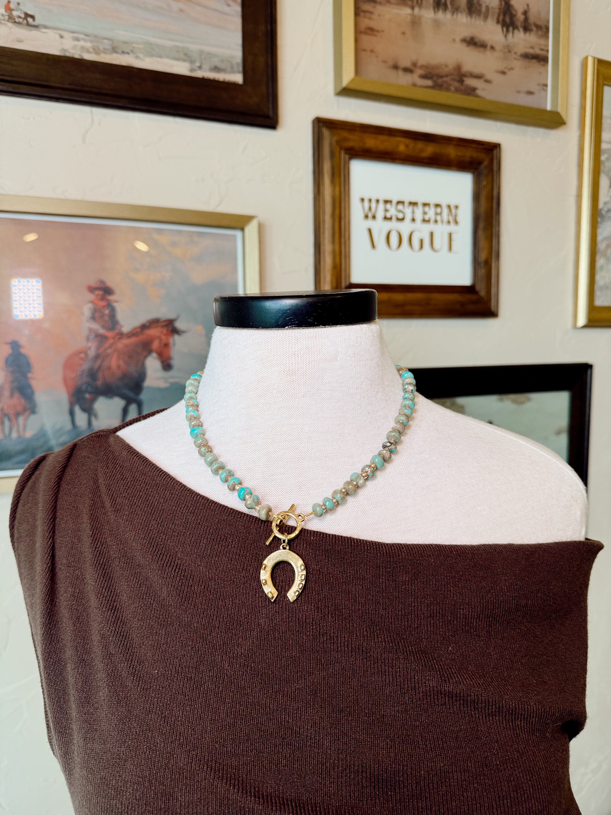 We are in love with this turquoise & gold horseshoe necklace!! The perfect addition to your jewelry stack! Make a statement with this gorgeous new necklace. Features hand-strung turquoise dyed jade beads & gold spacers.