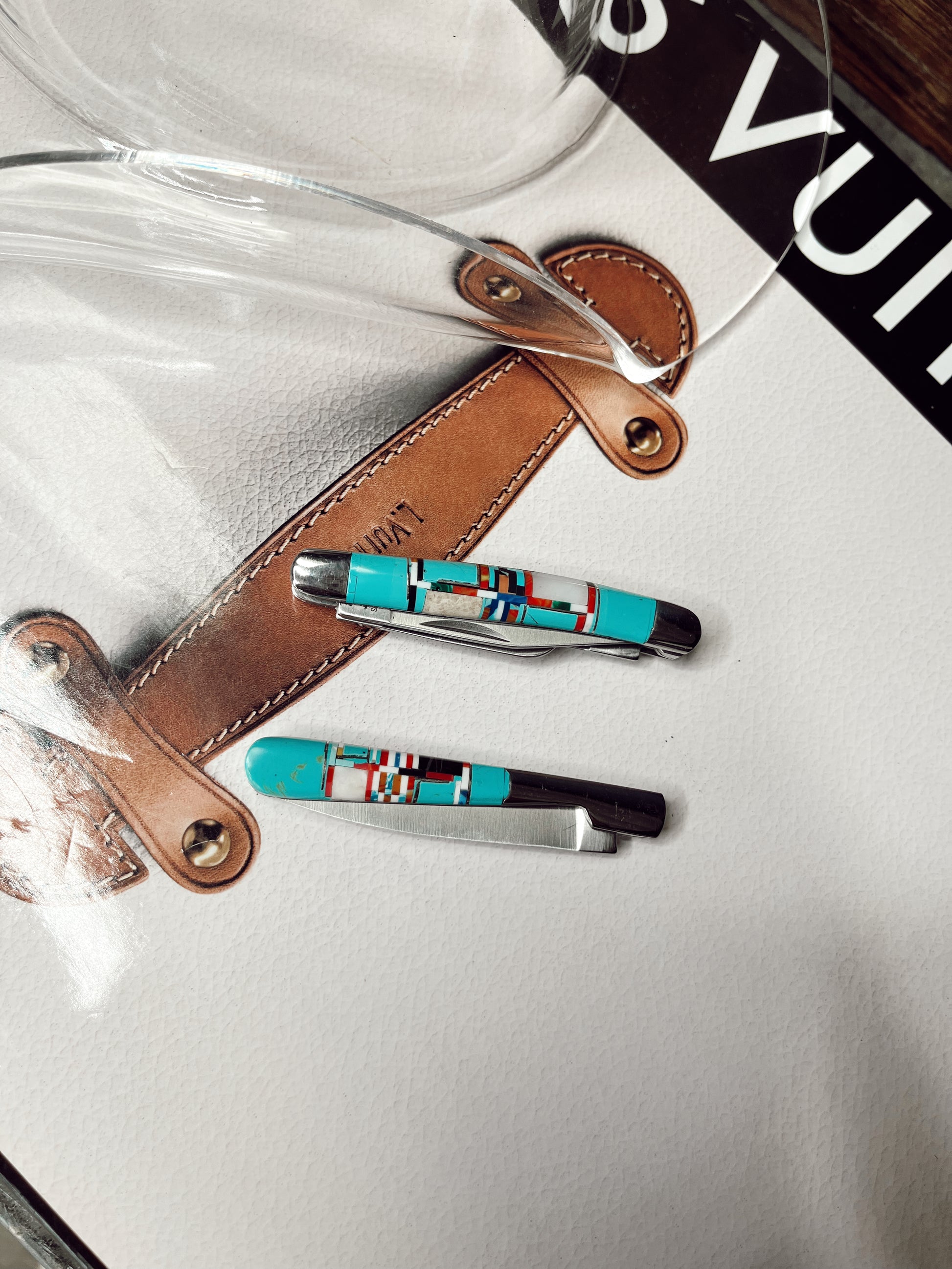 Every girl needs a cute tuquoise pocket knife, right?!! These turquoise inlay pocket knives make great gifts & they are so cool you will want one for yourself too! Available in small with multi blades & small with a single blade.